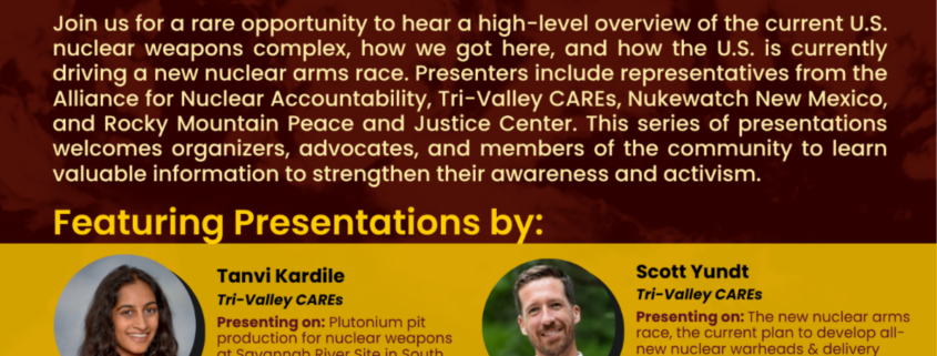 Join us for a rare opportunity to hear a high-level overview of the current U.S. nuclear weapons complex, how we got here, and how the U.S. is currently driving a new nuclear arms race. Presenters include representatives from the Alliance for Nuclear Accountability, Tri-Valley CAREs, Nukewatch New Mexico, and Rocky Mountain Peace and Justice Center. This series of presentations welcomes organizers, advocates, and members of the community to learn valuable information to strengthen their awareness and activism.