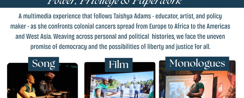 Through monologues, film, and live music, Uprooting Qahr! Power, Privilege, and Paperwork, follows Taishya Adams – educator, artist, and policy maker – as she confronts the colonial cancer that spread from Europe Africa to the Americas and West Asia.