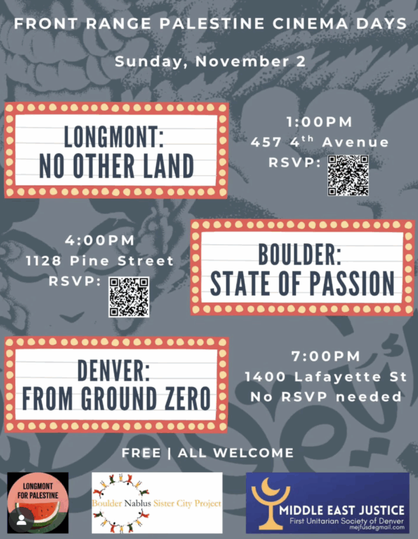 Join us for the Front Range Palestine Cinema Day, on Sunday, November 2nd.